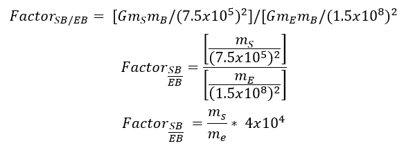Where ms is the mass of the Sun, and me is the mass of the Earth, and ms/me is about 333,000. Thus the factor by which the force of acceleration on the Sun by the barycentre is about 1.33×1010 times that of the force of acceleration on the Earth by the barycentre.